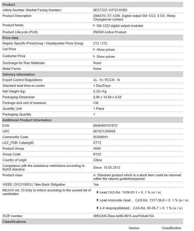 SIMATIC S7-1200, Digital output SM 1222, 8 DO, Relay Changeover contact