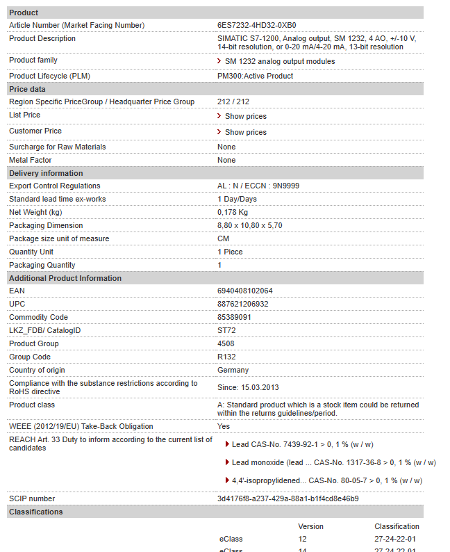 | SIMATIC S7-1200, Analog output, SM 1232, 4 AO, +/-10 V, 14-bit resolution, or 0-20 mA/4-20 mA, 13-bit resolution |