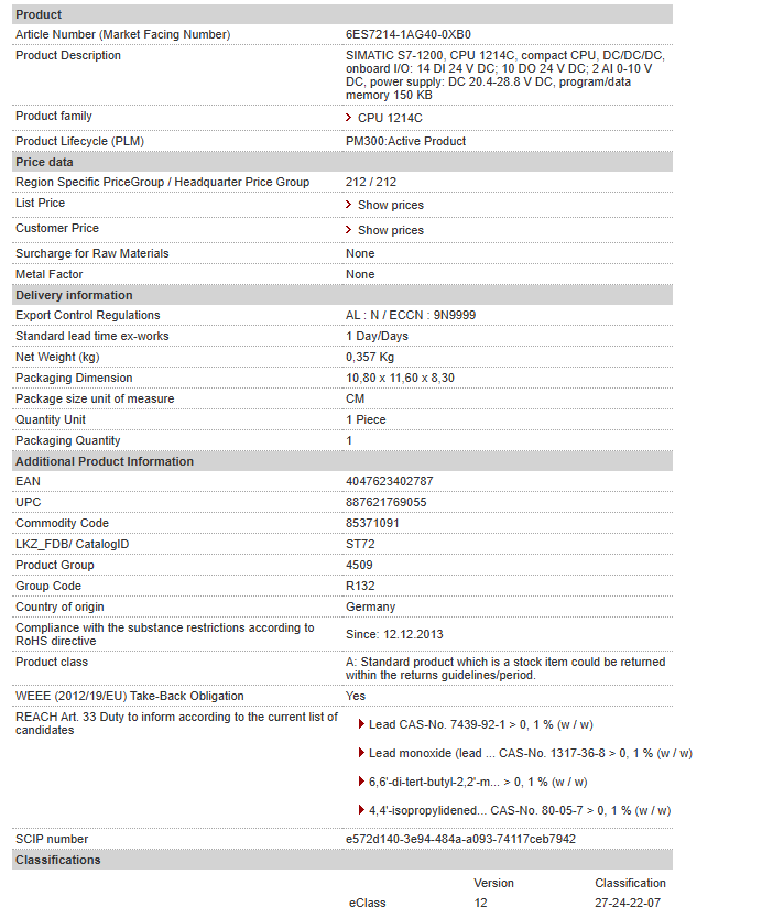 SIMATIC S7-1200, CPU 1214C, compact CPU, DC/DC/DC, onboard I/O: 14 DI 24 V DC; 10 DO 24 V DC; 2 AI 0-10 V DC, power supply: DC 20.4-28.8 V DC, program/data memory 150 KB