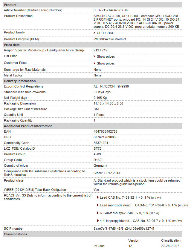 SIMATIC S7-1200, CPU 1215C, compact CPU, DC/DC/DC, 2 PROFINET ports, onboard I/O: 14 DI 24 V DC; 10 DO 24 V DC; 0.5 A; 2 AI 0-10 V DC, 2 AO 0-20 mA DC, power supply: DC 20.4-28.8 V DC, program/data……