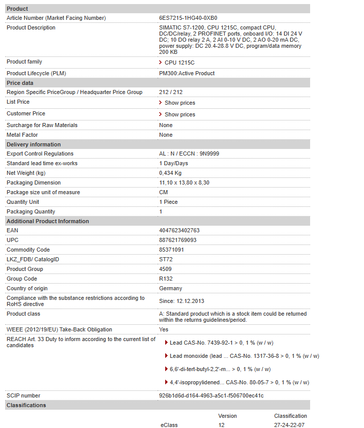 SIMATIC S7-1200, CPU 1215C, compact CPU, DC/DC/relay, 2 PROFINET ports, onboard I/O: 14 DI 24 V DC; 10 DO relay 2 A, 2 AI 0-10 V DC, 2 AO 0-20 mA DC, power supply: DC 20.4-28.8 V DC, program/data memory 200 KB