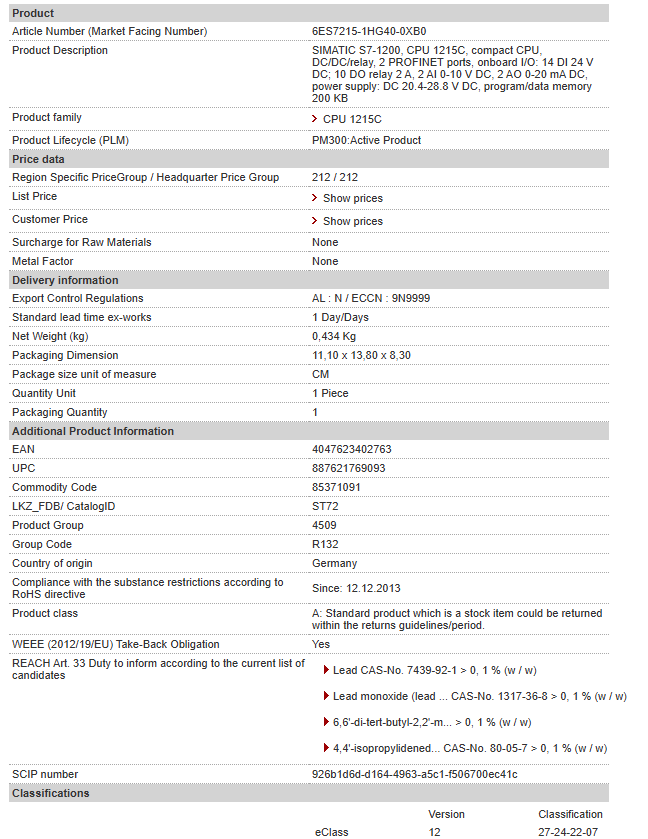 SIMATIC S7-1200, CPU 1215C, compact CPU, DC/DC/relay, 2 PROFINET ports, onboard I/O: 14 DI 24 V DC; 10 DO relay 2 A, 2 AI 0-10 V DC, 2 AO 0-20 mA DC, power supply: DC 20.4-28.8 V DC, program/data memory 200 KB