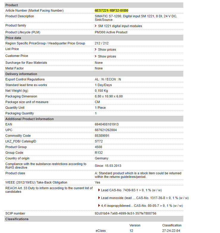 SIMATIC S7-1200, Digital input SM 1221, 8 DI, 24 V DC, Sink/Source