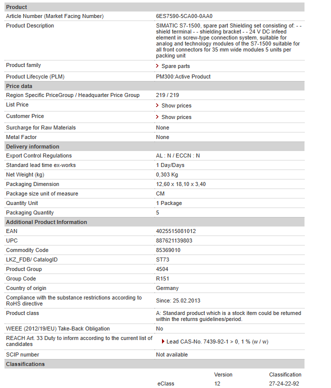 SIMATIC S7-1500, spare part Shielding set consisting of: – – shield terminal – – shielding bracket – – 24 V DC infeed element in screw-type connection system, suitable for analog and technology modules of the S7-1500 suitable for all front connectors for 35 mm wide modules 5 units per packing unit