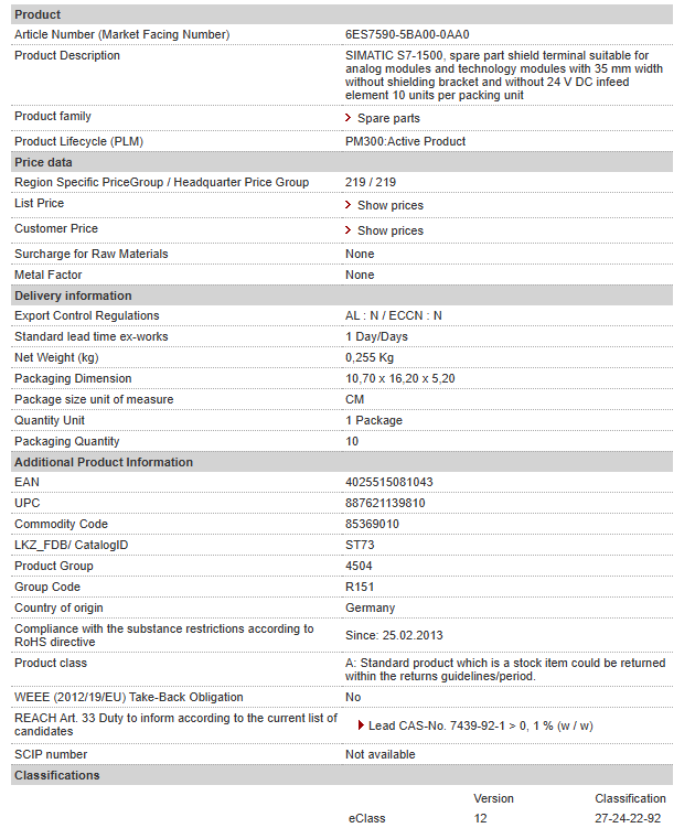 SIMATIC S7-1500, spare part shield terminal suitable for analog modules and technology modules with 35 mm width without shielding bracket and without 24 V DC infeed element 10 units per packing unit