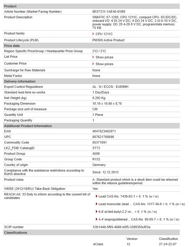 SIMATIC S7-1200, CPU 1211C, compact CPU, DC/DC/DC, onboard I/O: 6 DI 24 V DC; 4 DO 24 V DC; 2 AI 0-10 V DC, power supply: DC 20.4-28.8 V DC, program/data memory 75 KB