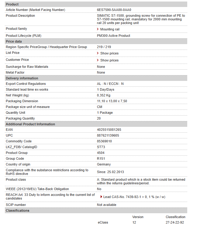 SIMATIC S7-1500, grounding screw for connection of PE to S7-1500 mounting rail; mandatory for 2000 mm mounting rail 20 units per packing unit