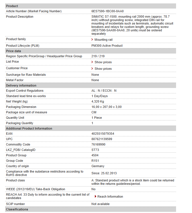 SIMATIC S7-1500, mounting rail 2000 mm (approx. 78.7 inch) without grounding screw, integrated DIN rail for mounting of incidentals such as terminals, automatic circuit breakers and relays for custom length, grounding screw (6ES7590-5AA00-0AA0, 20 units) must be ordered separately