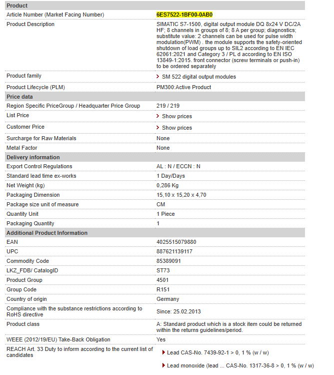 SIMATIC S7-1500, digital output module DQ 8×24 V DC/2A HF; 8 channels in groups of 8; 8 A per group; diagnostics; substitute value: 2 channels can be used for pulse width modulation(PWM) . the module supports the safety-oriented shutdown of load groups up to SIL2 according to EN IEC 62061:2021 and Category 3 / PL d according to EN ISO 13849-1:2015. front connector (screw terminals or push-in) to be ordered separately
