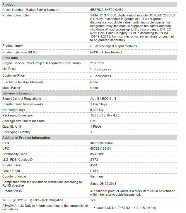 | SIMATIC S7-1500, digital output module DQ 8xAC 230V/5A ST; relay; 8 channels in groups of 1; 5 A per group; diagnostics; substitute value: switching cycle counter for integrated relay, the module supports the safety-oriented shutdown of load groups up to SIL1 according to EN IEC 62061:2021 and Category 2 / PL c according to EN ISO 13849-1:2015. front connector (screw terminals or push-in) to be ordered separately |
