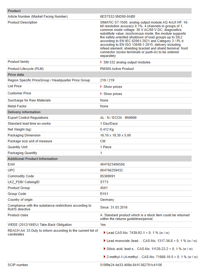 SIMATIC S7-1500, analog output module AQ 4xU/I HF, 16-bit resolution accuracy 0.1%, 4 channels in groups of 1, common mode voltage: 30 V AC/60 V DC, diagnostics; substitute value, isochronous mode; the module supports the safety-oriented shutdown of load groups up to SIL2 according to EN IEC 62061:2021 and Category 3 / PL d according to EN ISO 13849-1:2015. delivery including infeed element, shielding bracket and shield terminal: front connector (screw terminals or push-in) to be ordered separately