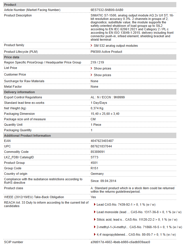 SIMATIC S7-1500, analog output module AQ 2x U/I ST, 16-bit resolution accuracy 0.3%. 2 channels in groups of 2, diagnostics; substitute value; the module supports the safety-oriented shutdown of load groups up to SIL2 according to EN IEC 62061:2021 and Category 2 / PL c according to EN ISO 13849-1:2015. delivery including front connector push-in, infeed element, shielding bracket and shield terminal