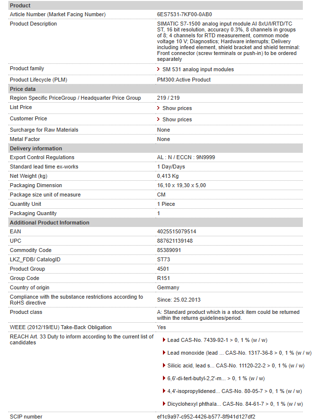 SIMATIC S7-1500 analog input module AI 8xU/I/RTD/TC ST, 16 bit resolution, accuracy 0.3%, 8 channels in groups of 8; 4 channels for RTD measurement, common mode voltage 10 V; Diagnostics; Hardware interrupts; Delivery including infeed element, shield bracket and shield terminal: Front connector (screw terminals or push-in) to be ordered separately