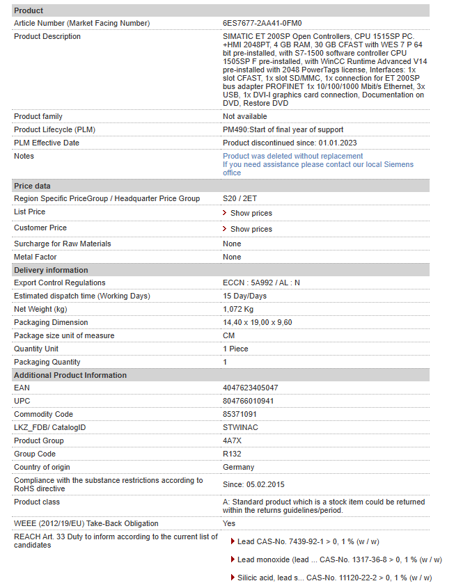 SIMATIC ET 200SP Open Controllers, CPU 1515SP PC. +HMI 2048PT, 4 GB RAM, 30 GB CFAST with WES 7 P 64 bit pre-installed, with S7-1500 software controller CPU 1505SP F pre-installed, with WinCC Runti……