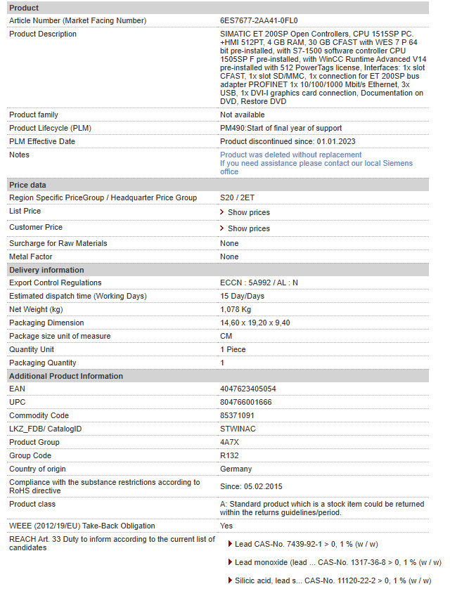 SIMATIC ET 200SP Open Controllers, CPU 1515SP PC. +HMI 512PT, 4 GB RAM, 30 GB CFAST with WES 7 P 64 bit pre-installed, with S7-1500 software controller CPU 1505SP F pre-installed, with WinCC Runtim……