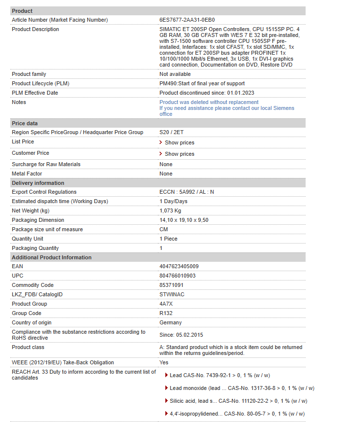 SIMATIC ET 200SP Open Controllers, CPU 1515SP PC. 4 GB RAM, 30 GB CFAST with WES 7 E 32 bit pre-installed, with S7-1500 software controller CPU 1505SP F pre-installed, Interfaces: 1x slot CFAST, 1x slot SD/MMC, 1x connection for ET 200SP bus adapter PROFINET 1x 10/100/1000 Mbit/s Ethernet, 3x USB, 1x DVI-I graphics card connection, Documentation on DVD, Restore DVD