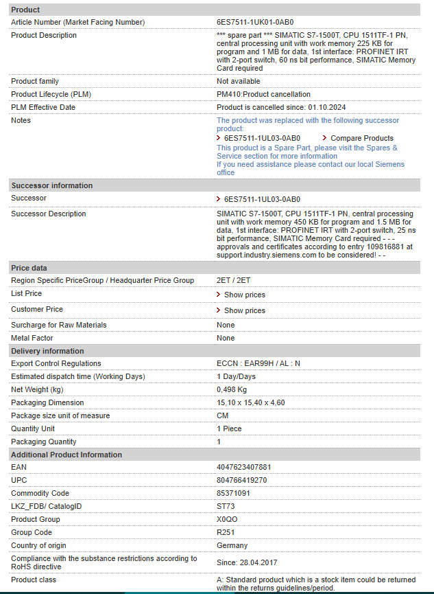 | *** spare part *** SIMATIC S7-1500T, CPU 1511TF-1 PN, central processing unit with work memory 225 KB for program and 1 MB for data, 1st interface: PROFINET IRT with 2-port switch, 60 ns bit performance, SIMATIC Memory Card required |