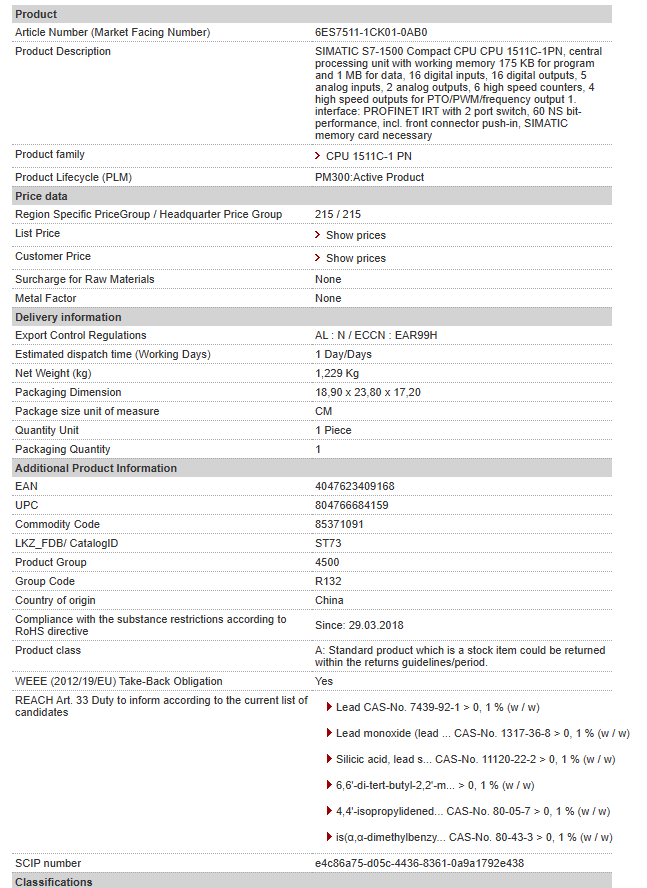 SIMATIC S7-1500 Compact CPU CPU 1511C-1PN, central processing unit with working memory 175 KB for program and 1 MB for data, 16 digital inputs, 16 digital outputs, 5 analog inputs, 2 analog outputs……