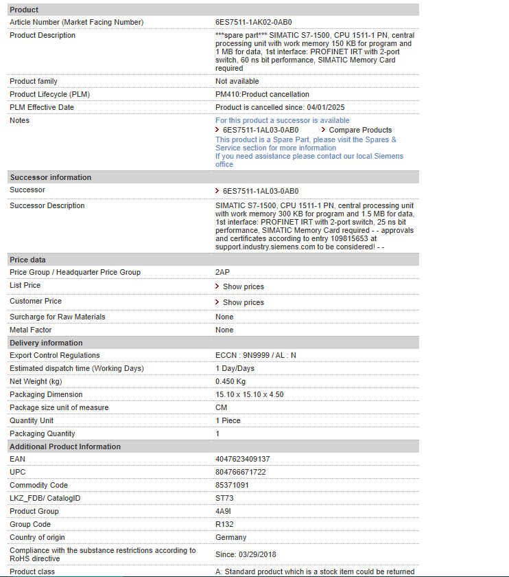 ***spare part*** SIMATIC S7-1500, CPU 1511-1 PN, central processing unit with work memory 150 KB for program and 1 MB for data, 1st interface: PROFINET IRT with 2-port switch, 60 ns bit performance……