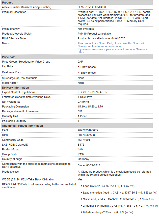 ***spare part*** SIMATIC S7-1500, CPU 1513-1 PN, central processing unit with work memory 300 KB for program and 1.5 MB for data, 1st interface: PROFINET IRT with 2-port switch, 40 ns bit performan……