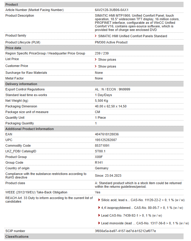 SIMATIC HMI MTP1900, Unified Comfort Panel, touch operation, 18.5″ widescreen TFT display, 16 million colors, PROFINET interface, configurable as of WinCC Unified Comfort V16, contains open-source software, which is provided free of charge see enclosed DVD