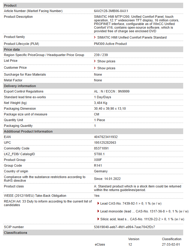 SIMATIC HMI MTP1200, Unified Comfort Panel, touch operation, 12.1″ widescreen TFT display, 16 million colors, PROFINET interface, configurable as of WinCC Unified Comfort V16, contains open-source software, which is provided free of charge see enclosed DVD