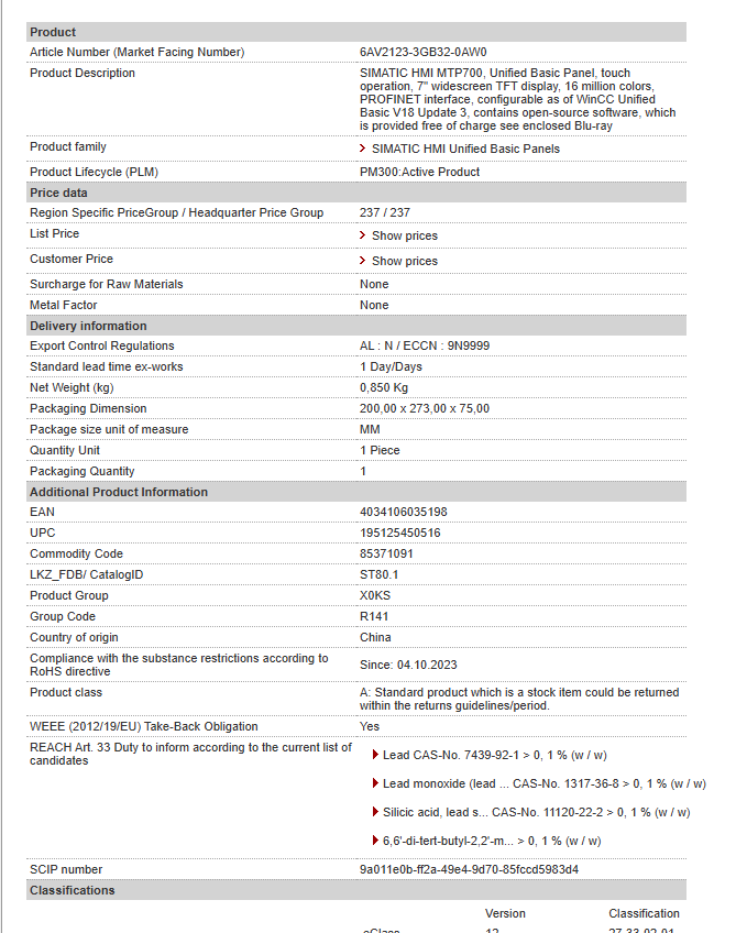SIMATIC HMI MTP700, Unified Basic Panel, touch operation, 7″ widescreen TFT display, 16 million colors, PROFINET interface, configurable as of WinCC Unified Basic V18 Update 3, contains open-source software, which is provided free of charge see enclosed Blu-ray