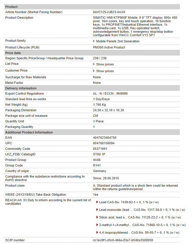 SIMATIC HMI KTP900F Mobile, 9.0″ TFT display, 800x 480 pixel, 16m colors, key and touch operation, 10 function keys, 1x PROFINET/Industrial Ethernet interface, 1x multimedia card, 1x USB, Key-operated switch, acknowledgement button, 1 emergency stop/stop button configurable from WinCC Comfort V13 SP1