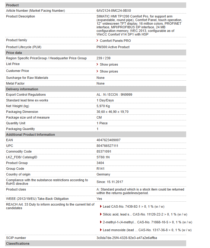 SIMATIC HMI TP1200 Comfort Pro, for support arm (expandable, round pipe), Comfort Panel, touch operation, 12” widescreen TFT display, 16 million colors, PROFINET interface, MPI/PROFIBUS DP interface, 24 MB configuration memory, WEC 2013, configurable as of WinCC Comfort V14 SP1 with HSP