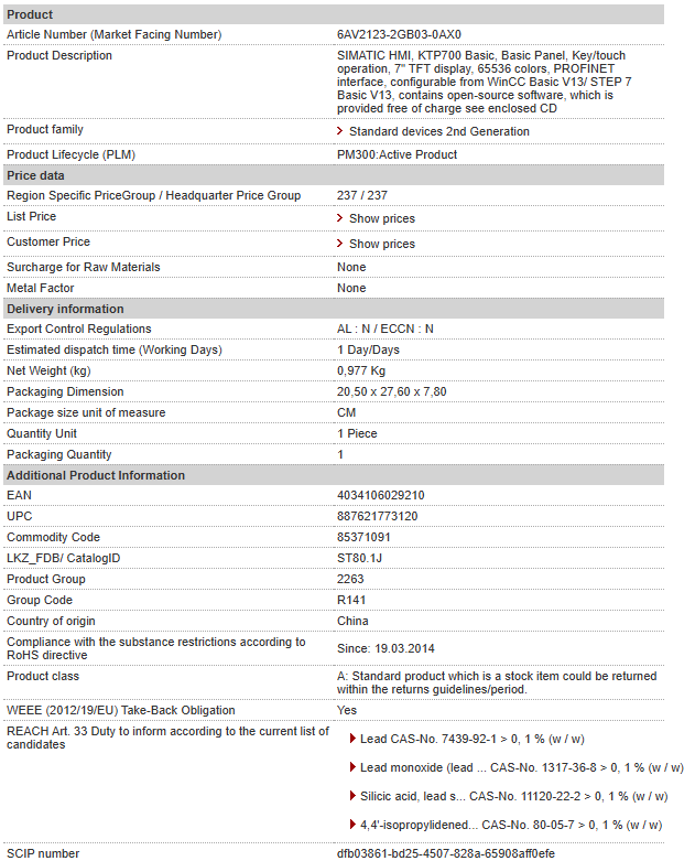 SIMATIC HMI, KTP700 Basic, Basic Panel, Key/touch operation, 7″ TFT display, 65536 colors, PROFINET interface, configurable from WinCC Basic V13/ STEP 7 Basic V13, contains open-source software, which is provided free of charge see enclosed CD