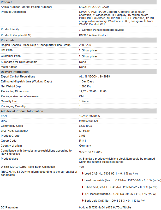 SIMATIC HMI TP700 Comfort, Comfort Panel, touch operation, 7″ widescreen TFT display, 16 million colors, PROFINET interface, MPI/PROFIBUS DP interface, 12 MB configuration memory, Windows CE 6.0, configurable from WinCC Comfort V11