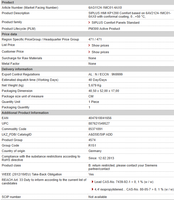 SIPLUS HMI KP1200 Comfort based on 6AV2124-1MC01-0AX0 with conformal coating, 0…+50 °C,
