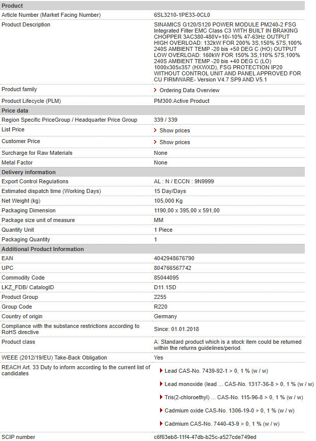 SINAMICS G120/S120 POWER MODULE PM240-2 FSG Integrated Filter EMC Class C3 WITH BUILT IN BRAKING CHOPPER 3AC380-480V+10/-10% 47-63Hz OUTPUT HIGH OVERLOAD: 132kW FOR 200% 3S,150% 57S,100% 240S AMBIENT TEMP -20 bis +50 DEG C (HO) OUTPUT LOW OVERLOAD: 160kW FOR 150% 3S,110% 57S,100% 240S AMBIENT TEMP -20 bis +40 DEG C (LO) 1000x305x357 (HXWXD), FSG PROTECTION IP20 WITHOUT CONTROL UNIT AND PANEL APPROVED FOR CU FIRMWARE- Version V4.7 SP9 AND V5.1
