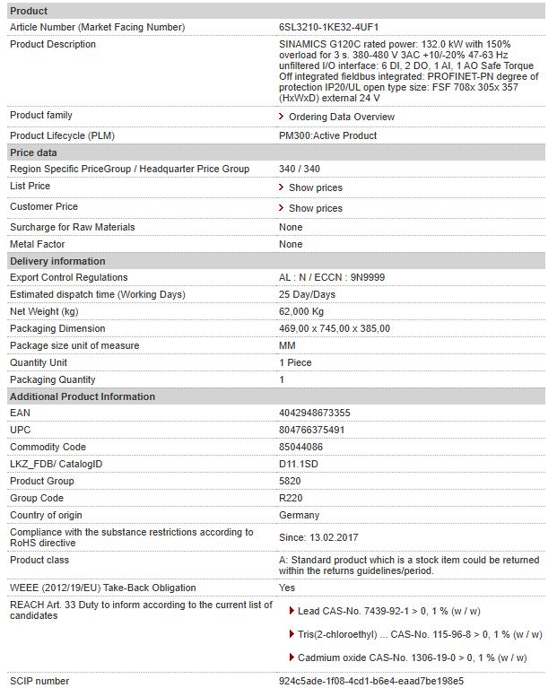 SINAMICS G120C rated power: 132.0 kW with 150% overload for 3 s. 380-480 V 3AC +10/-20% 47-63 Hz unfiltered I/O interface: 6 DI, 2 DO, 1 AI, 1 AO Safe Torque Off integrated fieldbus integrated: PRO……