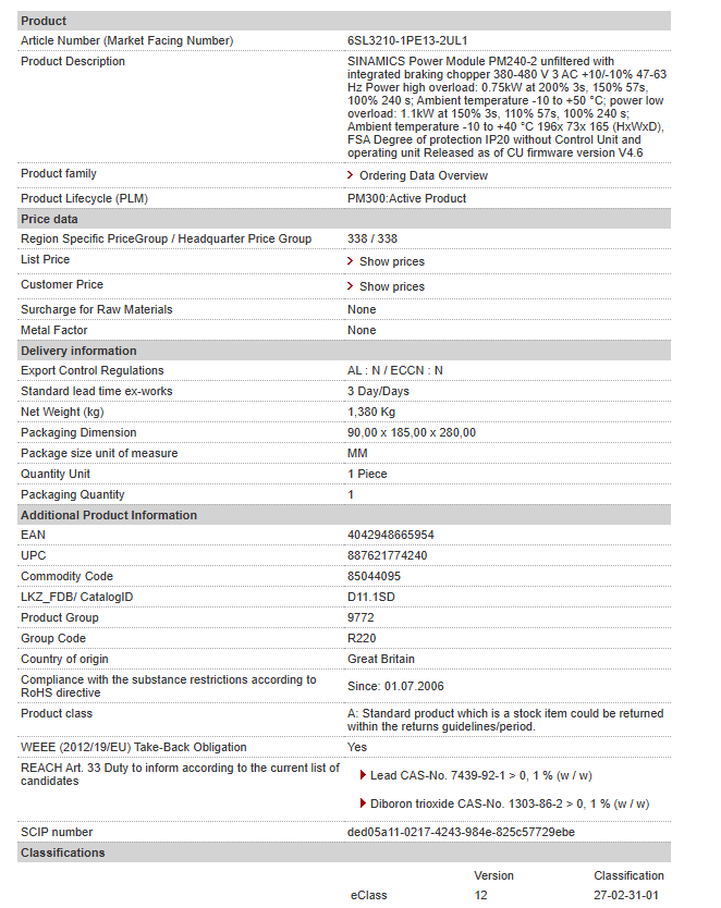 | SINAMICS Power Module PM240-2 unfiltered with integrated braking chopper 380-480 V 3 AC +10/-10% 47-63 Hz Power high overload: 0.75kW at 200% 3s, 150% 57s, 100% 240 s; Ambient temperature -10 to +50 °C; power low overload: 1.1kW at 150% 3s, 110% 57s, 100% 240 s; Ambient temperature -10 to +40 °C 196x 73x 165 (HxWxD), FSA Degree of protection IP20 without Control Unit and operating unit Released as of CU firmware version V4.6 |