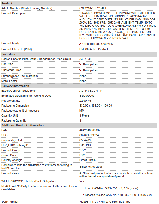 SINAMICS POWER MODULE PM240-2 WITHOUT FILTER WITH BUILT IN BRAKING CHOPPER 3AC380-480V +10/-10% 47-63HZ OUTPUT HIGH OVERLOAD: 4KW FOR 200% 3S,150% 57S,100% 240S AMBIENT TEMP -10 TO +50 DEG C OUTPUT LOW OVERLOAD: 5,5KW FOR 150% 3S,110% 57S,100% 240S AMBIENT TEMP -10 TO +40 DEG C 291 X 100 X 165 (HXWXD), FSB PROTECTION IP20 WITHOUT CONTROL UNIT AND PANEL APPROVED FOR CU FIRMWARE- VERSION V4.6