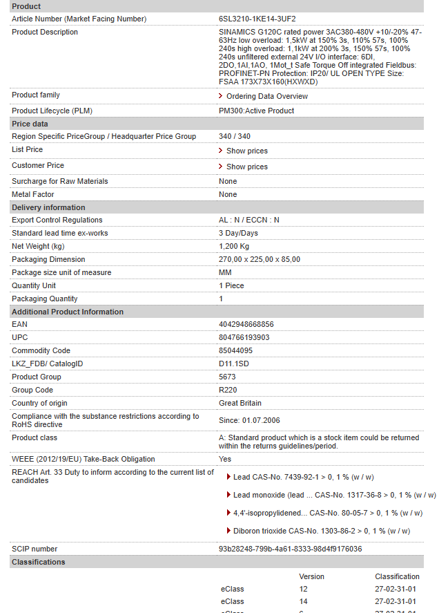SINAMICS G120C rated power 3AC380-480V +10/-20% 47-63Hz low overload: 1,5kW at 150% 3s, 110% 57s, 100% 240s high overload: 1,1kW at 200% 3s, 150% 57s, 100% 240s unfiltered external 24V I/O interface: 6DI, 2DO,1AI,1AO, 1Mot_t Safe Torque Off integrated Fieldbus: PROFINET-PN Protection: IP20/ UL OPEN TYPE Size: FSAA 173X73X160(HXWXD)