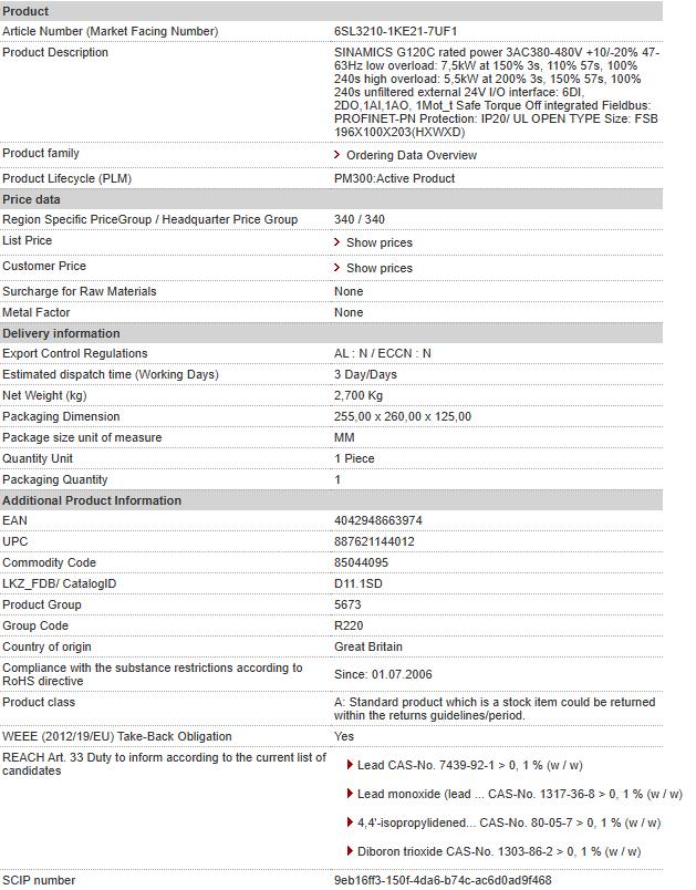 SINAMICS G120C rated power 3AC380-480V +10/-20% 47-63Hz low overload: 7,5kW at 150% 3s, 110% 57s, 100% 240s high overload: 5,5kW at 200% 3s, 150% 57s, 100% 240s unfiltered external 24V I/O interface: 6DI, 2DO,1AI,1AO, 1Mot_t Safe Torque Off integrated Fieldbus: PROFINET-PN Protection: IP20/ UL OPEN TYPE Size: FSB 196X100X203(HXWXD)