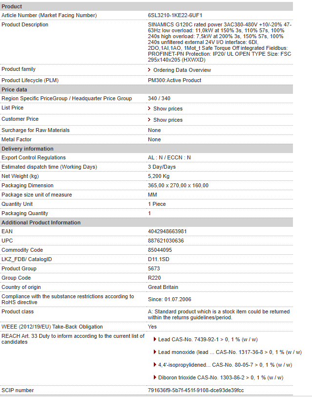 SINAMICS G120C rated power 3AC380-480V +10/-20% 47-63Hz low overload: 11,0kW at 150% 3s, 110% 57s, 100% 240s high overload: 7,5kW at 200% 3s, 150% 57s, 100% 240s unfiltered external 24V I/O interface: 6DI, 2DO,1AI,1AO, 1Mot_t Safe Torque Off integrated Fieldbus: PROFINET-PN Protection: IP20/ UL OPEN TYPE Size: FSC 295x140x205 (HXWXD)