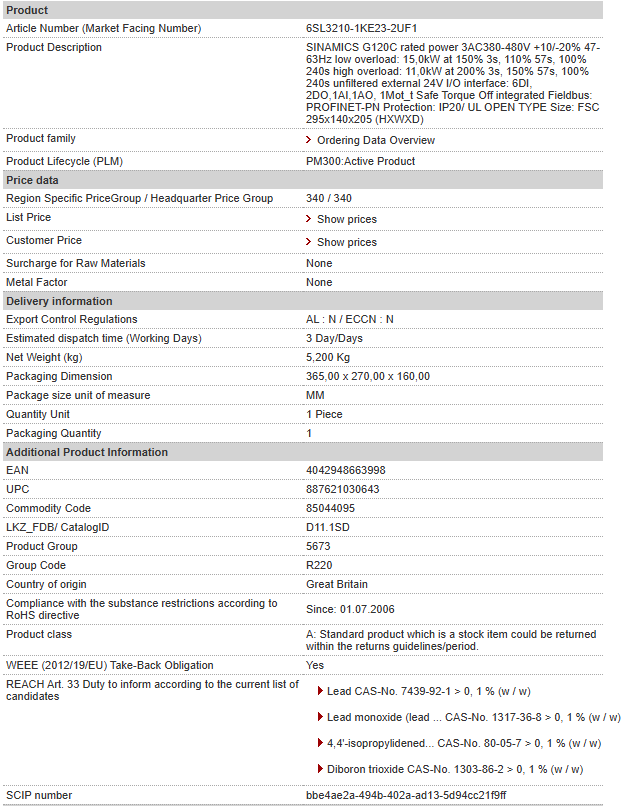 SINAMICS G120C rated power 3AC380-480V +10/-20% 47-63Hz low overload: 15,0kW at 150% 3s, 110% 57s, 100% 240s high overload: 11,0kW at 200% 3s, 150% 57s, 100% 240s unfiltered external 24V I/O interface: 6DI, 2DO,1AI,1AO, 1Mot_t Safe Torque Off integrated Fieldbus: PROFINET-PN Protection: IP20/ UL OPEN TYPE Size: FSC 295x140x205 (HXWXD)