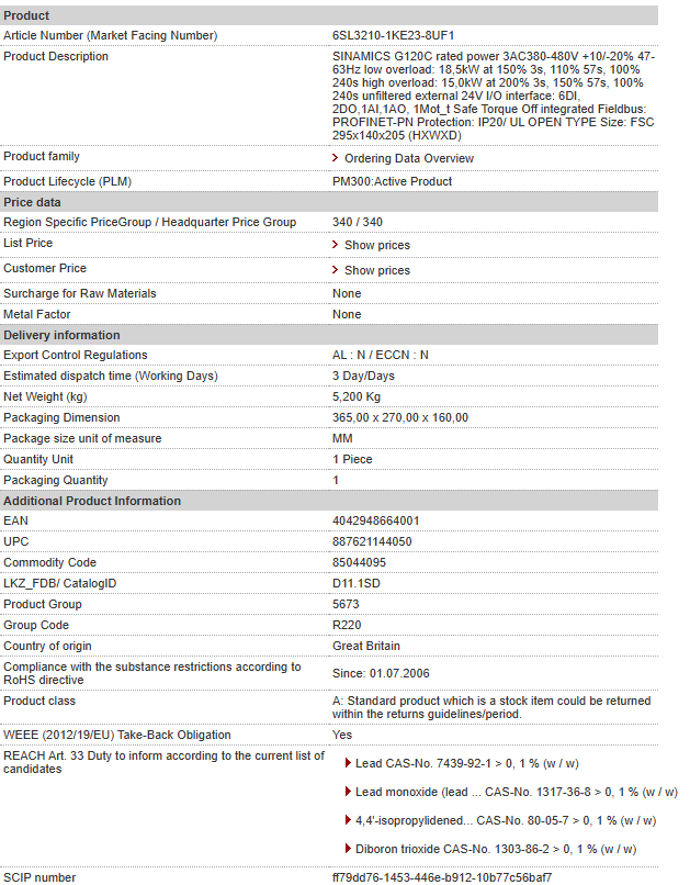 SINAMICS G120C rated power 3AC380-480V +10/-20% 47-63Hz low overload: 18,5kW at 150% 3s, 110% 57s, 100% 240s high overload: 15,0kW at 200% 3s, 150% 57s, 100% 240s unfiltered external 24V I/O interf……
