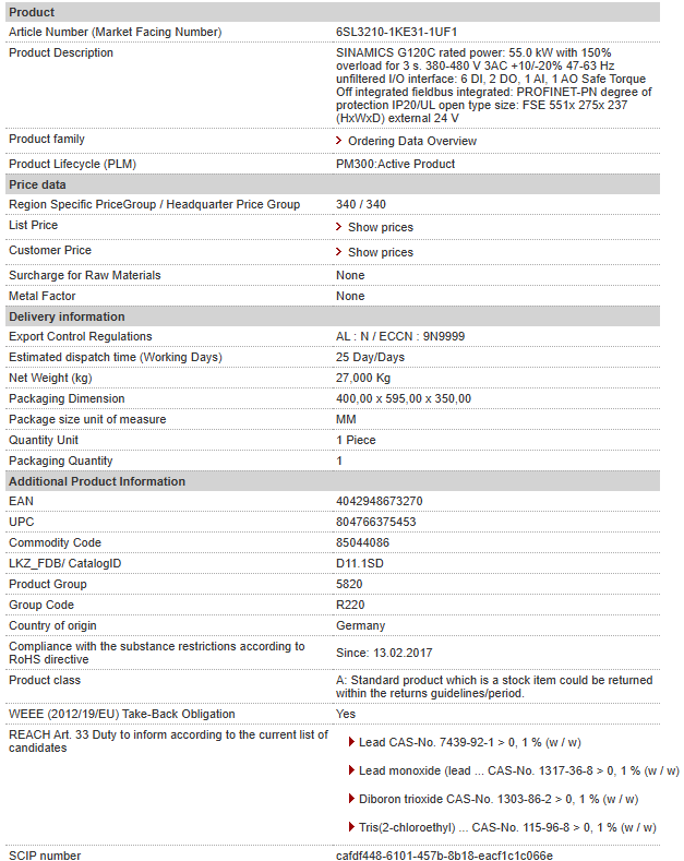 INAMICS G120C rated power: 55.0 kW with 150% overload for 3 s. 380-480 V 3AC +10/-20% 47-63 Hz unfiltered I/O interface: 6 DI, 2 DO, 1 AI, 1 AO Safe Torque Off integrated fieldbus integrated: PROFINET-PN degree of protection IP20/UL open type size: FSE 551x 275x 237 (HxWxD) external 24 V