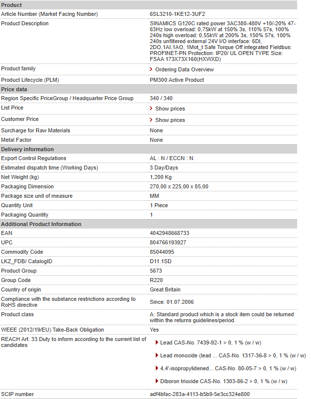 SINAMICS G120C rated power 3AC380-480V +10/-20% 47-63Hz low overload: 0,75kW at 150% 3s, 110% 57s, 100% 240s high overload: 0,55kW at 200% 3s, 150% 57s, 100% 240s unfiltered external 24V I/O interface: 6DI, 2DO,1AI,1AO, 1Mot_t Safe Torque Off integrated Fieldbus: PROFINET-PN Protection: IP20/ UL OPEN TYPE Size: FSAA 173X73X160(HXWXD)