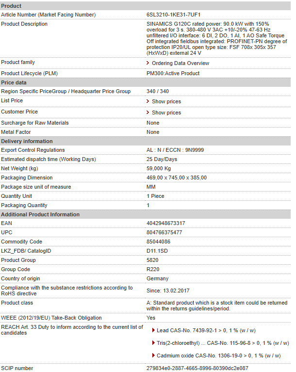 SINAMICS G120C rated power: 90.0 kW with 150% overload for 3 s. 380-480 V 3AC +10/-20% 47-63 Hz unfiltered I/O interface: 6 DI, 2 DO, 1 AI, 1 AO Safe Torque Off integrated fieldbus integrated: PROFINET-PN degree of protection IP20/UL open type size: FSF 708x 305x 357 (HxWxD) external 24 V