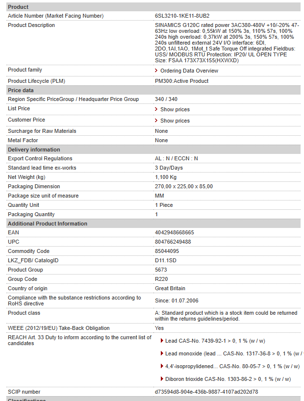 SINAMICS G120C rated power 3AC380-480V +10/-20% 47-63Hz low overload: 0,55kW at 150% 3s, 110% 57s, 100% 240s high overload: 0,37kW at 200% 3s, 150% 57s, 100% 240s unfiltered external 24V I/O interface: 6DI, 2DO,1AI,1AO, 1Mot_t Safe Torque Off integrated Fieldbus: USS/ MODBUS RTU Protection: IP20/ UL OPEN TYPE Size: FSAA 173X73X155(HXWXD)