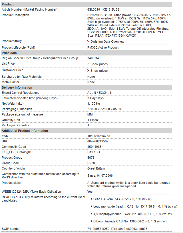 SINAMICS G120C rated power 3AC380-480V +10/-20% 47-63Hz low overload: 1,1kW at 150% 3s, 110% 57s, 100% 240s high overload: 0,75kW at 200% 3s, 150% 57s, 100% 240s unfiltered external 24V I/O interface: 6DI, 2DO,1AI,1AO, 1Mot_t Safe Torque Off integrated Fieldbus: USS/ MODBUS RTU Protection: IP20/ UL OPEN TYPE Size: FSAA 173X73X155(HXWXD)