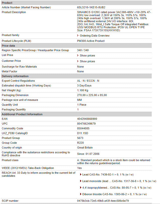 SINAMICS G120C rated power 3AC380-480V +10/-20% 47-63Hz low overload: 2,2kW at 150% 3s, 110% 57s, 100% 240s high overload: 1,5kW at 200% 3s, 150% 57s, 100% 240s unfiltered external 24V I/O interface: 6DI, 2DO,1AI,1AO, 1Mot_t Safe Torque Off integrated Fieldbus: USS/ MODBUS RTU Protection: IP20/ UL OPEN TYPE Size: FSAA 173X73X155(HXWXD)