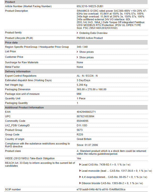 SINAMICS G120C rated power 3AC380-480V +10/-20% 47-63Hz low overload: 15,0kW at 150% 3s, 110% 57s, 100% 240s high overload: 11,0kW at 200% 3s, 150% 57s, 100% 240s unfiltered external 24V I/O interface: 6DI, 2DO,1AI,1AO, 1Mot_t Safe Torque Off integrated Fieldbus: USS/ MODBUS RTU Protection: IP20/ UL OPEN TYPE Size: FSC 295X140X203(HXWXD)