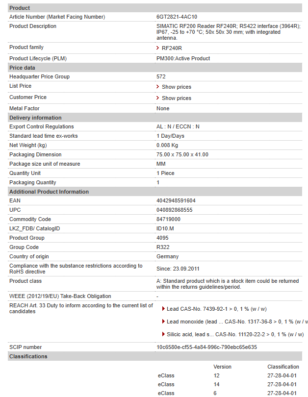 SIMATIC RF200 Reader RF240R; RS422 interface (3964R); IP67, -25 to +70 °C; 50x 50x 30 mm; with integrated antenna.