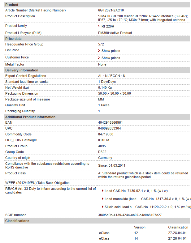SIMATIC RF200 reader RF220R; RS422 interface (3964R); IP67, -25 to +70 °C; M30x 71mm; with integrated antenna.